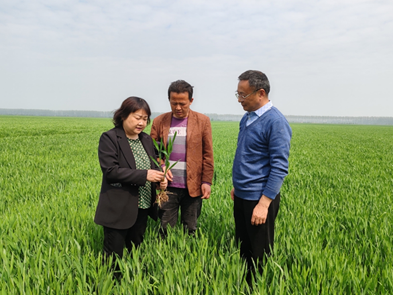 4月10日,王玉叶(左一)在寿西湖农场公司调研指导一喷三防,查看小麦长势。