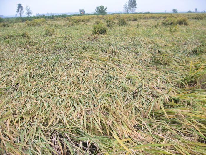 台风大雨袭击,致使水稻、棉花等农作物严重受灾。据初步统计,农作物倒伏面积达