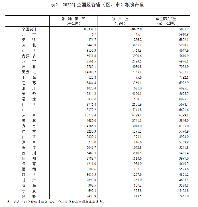 根据对全国31个省(区、市)的调查,2022年全国粮食播种面积、单位面积产量和总产量分别如下: